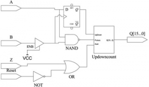 該測試模塊需要從天線平臺測試仿真轉(zhuǎn)臺接受平臺的位置信息,在各類運(yùn)動控制系統(tǒng)中,常采用增量式光電編碼器作為反饋檢測元件,其輸出為相差90度的A、B兩相信號以及周期脈沖復(fù)位信號Z,A、B兩相信號相差的正負(fù)決定運(yùn)動的正反方向,A、B兩相信號的脈沖輸出計(jì)數(shù)決定位置運(yùn)動的大小,Z為過零復(fù)位脈沖。整個解碼邏輯設(shè)計(jì)如圖2所示。