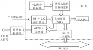 增量式編碼器解碼模塊與422差分接收器配合,用于天線仿真轉(zhuǎn)臺兩軸位置數(shù)據(jù)的解碼;DSP主處理器完成測試數(shù)據(jù)的處理,PXI接口模塊主要完成PCI總線信號到本地總線的轉(zhuǎn)換接口;RS-232接口模塊接受PSD(光敏位置探測器)的串行輸出信號,PSD在測試系統(tǒng)中用于探測天線平臺的跟蹤仿真轉(zhuǎn)臺運(yùn)動的誤差。