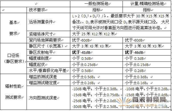 天線輻射參數要求在自由空間中進行測試,現實中,只能盡可能的模擬自由空間,稱為準自由空間。高質量的現代微波暗室是目前最好的準自由空間。通常有室內遠場測試、室內緊縮場測試及室內近場測試三類測試方法。理論上,這三類方法都是正確的,都有可能實現準確的測試,但實際上由于各自硬件條件的限制、經費預算的限制、以及對測試效率的期望,導致每一種測試方法所對應的實際系統會引入各自固有的測試誤差,從而限制了輻射參數測試的準確性。對此,需要對場地進行量化的要求,如靜區反射電平、尺寸的要求等等,保證測試精度。舉例如下(以直接遠場和緊縮場輻射參數測試場地為例):