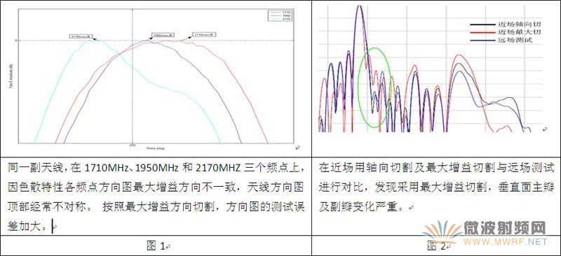 在近場測量沒有投入國內移動通信天線測試運營之前,行業內的專家對于上述定義沒有異議。但在近場測量投入測試運營之后,有專家對方向圖的切割基準有了另外一種說法,即按最大增益方向進行切割。同樣以上面的天線為例,對于不同的頻點,真實的波束水平面最大指向可能發生在96度,也可能在94度。從立體圖看,Θ=95度的水平面方向圖可能是各種各樣的:對稱的標準圓弧尖頂、圓弧平頂、偏斜一側或者同時兼有偏斜、馬鞍頂或者多波浪頂,以及各頻點指向的離散性等。同樣,對于垂直面方向圖,如果在最大值所對應的Φ角去切割,則會由于波束偏斜的不同、儀表接收值抖動的不同、頻點的不同,帶來Φ角的巨大變化。如下圖1、2所示,按最大增益方向切割方式,天線的測試誤差將會增大。