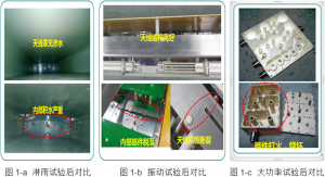 天線產(chǎn)品的可靠性的檢驗可以通過一系列試驗來判斷,可靠性試驗是對天線產(chǎn)品進行可靠性調(diào)查、分析和評價的重要手段。天線的可靠性試驗包括高低溫試驗、淋雨試驗、振動試驗、沖擊試驗、碰撞試驗、汽車運輸試驗、風(fēng)載試驗、攝冰試驗和功率試驗等。通過環(huán)境試驗可以檢驗天線產(chǎn)品結(jié)構(gòu)的可靠性。如圖1所示,為淋雨試驗、振動試驗和大功率試驗后,滿足可靠性要求的天線與不滿足的對比測試結(jié)果。
