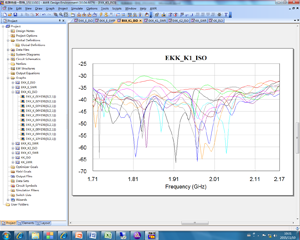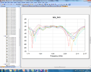 天線性能的一致性是指同一型號的天線產(chǎn)品的參數(shù)表現(xiàn)的吻合性,可以通過比較多個同類型產(chǎn)品的指標曲線的近似度來判斷。如圖4所示,為同一類型的多個天線電壓駐波比曲線的一致性對比,左圖的多個天線駐波比曲線趨勢一致,偏差較小,表明該類型天線駐波比性能比較一致;右圖的多個天線的駐波比曲線沒有規(guī)律,比較雜亂,表明該類型天線的駐波比性能一致性較差。圖5為天線隔離度性能的一致性比較,同樣左圖天線比右圖天線隔離度參數(shù)的一致性要好。因此,可以認為,左圖天線性能的一致性要好于右圖的天線。